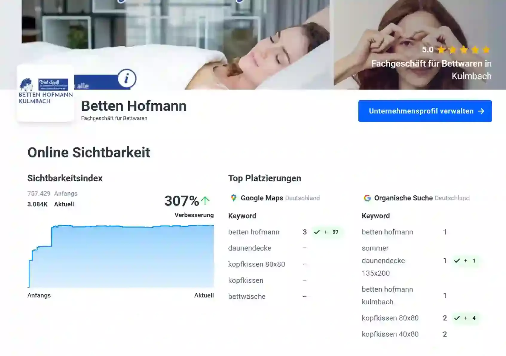 Für Betten Hofmann haben wir eine maßgeschneiderte Online-Marketing-Strategie umgesetzt, die sich auf SEO, Google Ads und Local Listing stützt.