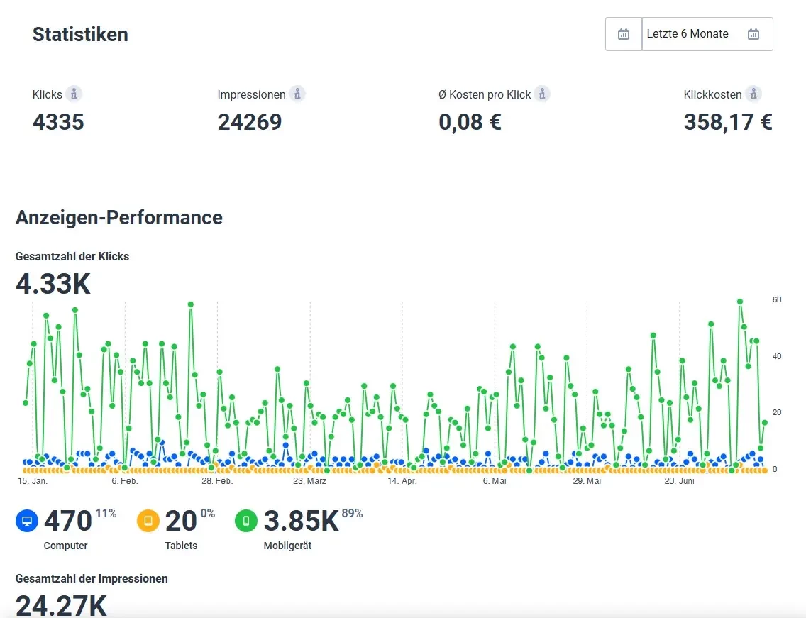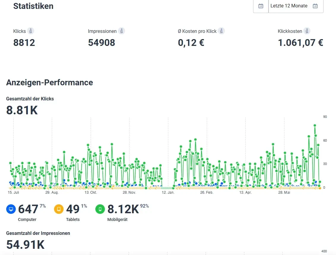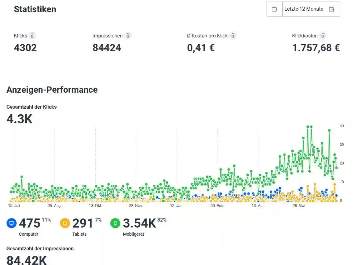 Diese Strategie sorgt für maximale Markenpräsenz, messbare Reichweite und mehr Kundeninteraktion online wie ofline. Seit März 2025 übernehmen wir zudem die komplette Werbebudgetplanung und -Steuerung - für nachhaltige und konkrete Erfolge.