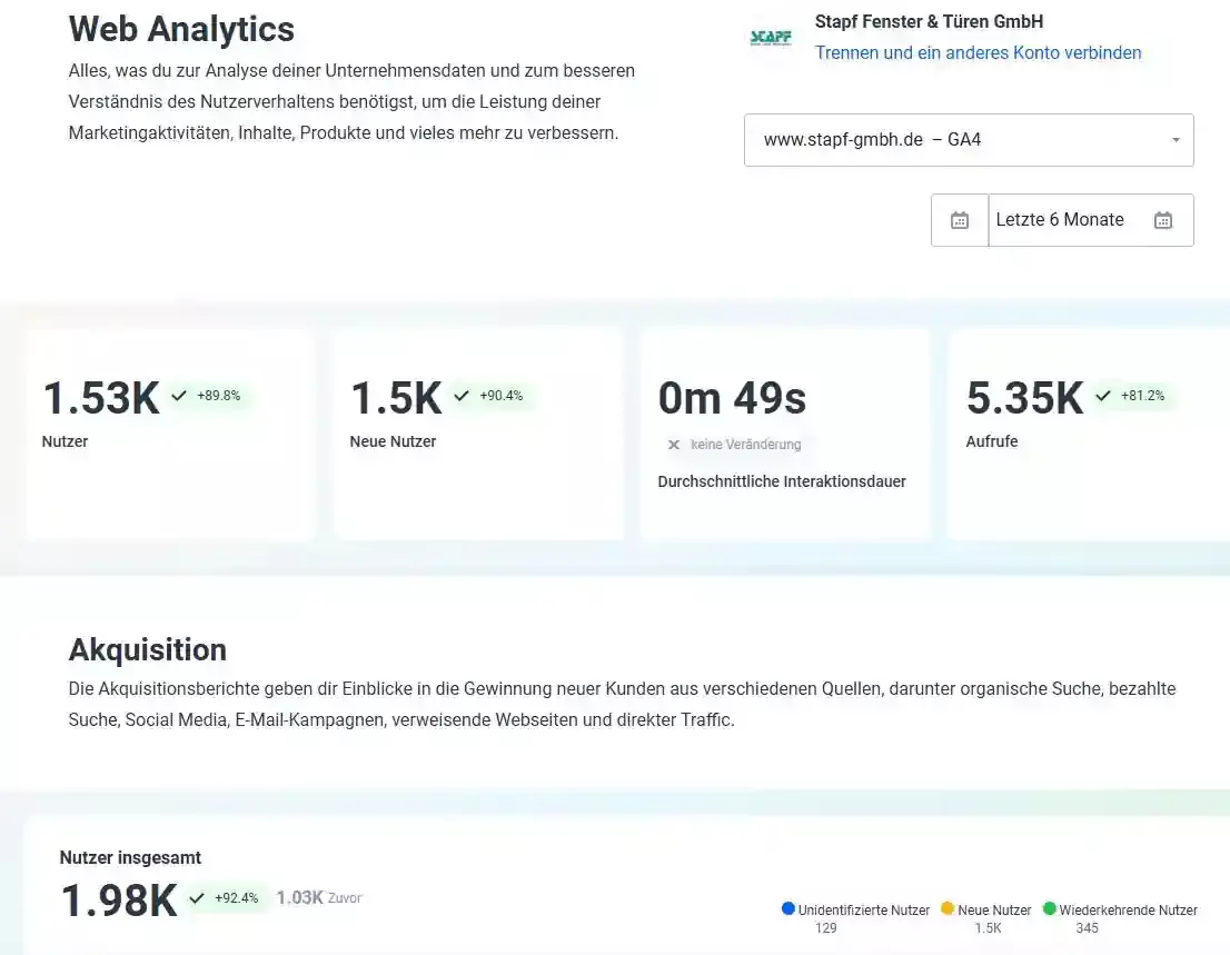 Maßnahmen wie die SEO-Optimierung, gezielte Google Ads-Kampagnen und die Pflege von Local Listings zeigen deutliche Wirkung: Die Sichtbarkeit in lokalen Suchergebnissen stieg, ebenso wie Klickrate, Conversion und organischer Traffic.