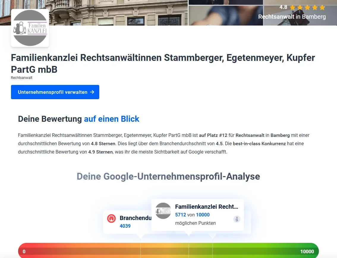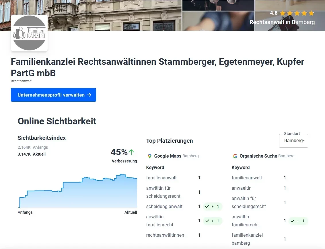 Gleichzeitig sorgt die positive Darstellung auf Bewertungsplattformen für Vertrauen bei potenziellen Mandanten. Durch konsequente Monitoring-Prozesse und Suchmaschinenoptimierung wurde die Sichtbarkeit in der Region stark gesteigert – mit klar messbaren Erfolgen und nachhaltiger Wirkung auf die Mandantenentwicklung.