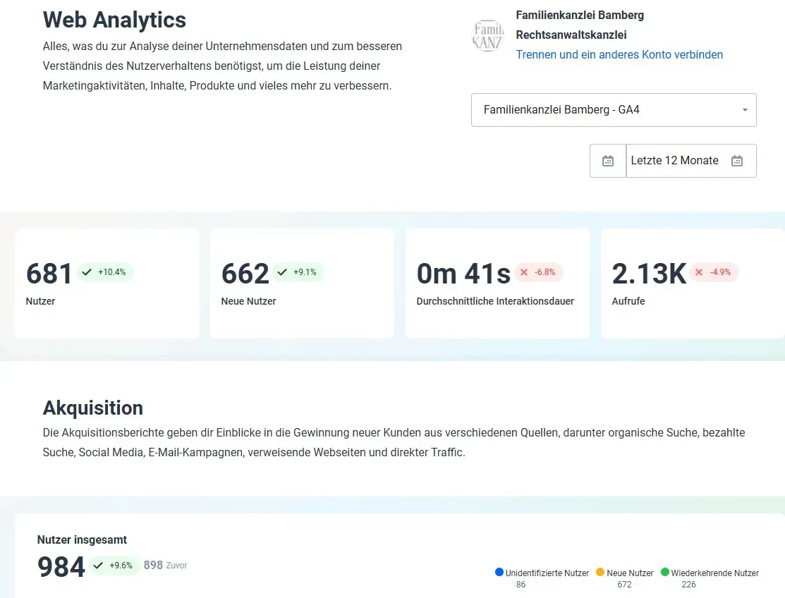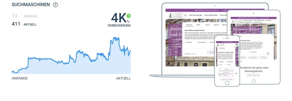 Für die Familienkanzlei in Bamberg entwickelten wir eine maßgeschneiderte Online-Marketing-Strategie, die auf Sichtbarkeit, Vertrauen und gezielte Mandantenansprache ausgelegt ist.