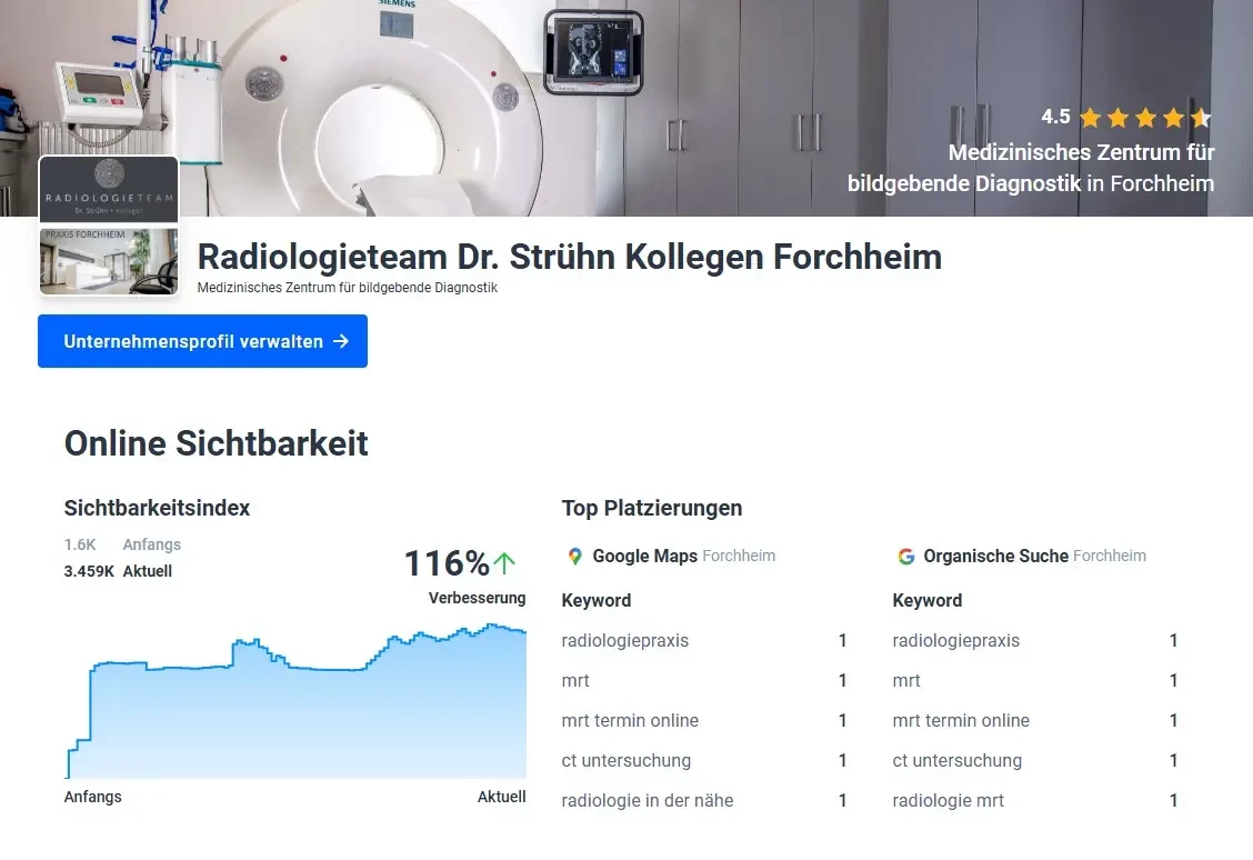 Einrichtung und Optimierung des Google-Business-Profils sowie weiterer relevanter Branchenverzeichnisse. Dadurch wird die Auffindbarkeit der Praxis in der lokalen Suche deutlich verbessert. Patienten finden so schnell alle wichtigen Informationen wie Adresse, Öffnungszeiten und Kontaktmöglichkeiten.