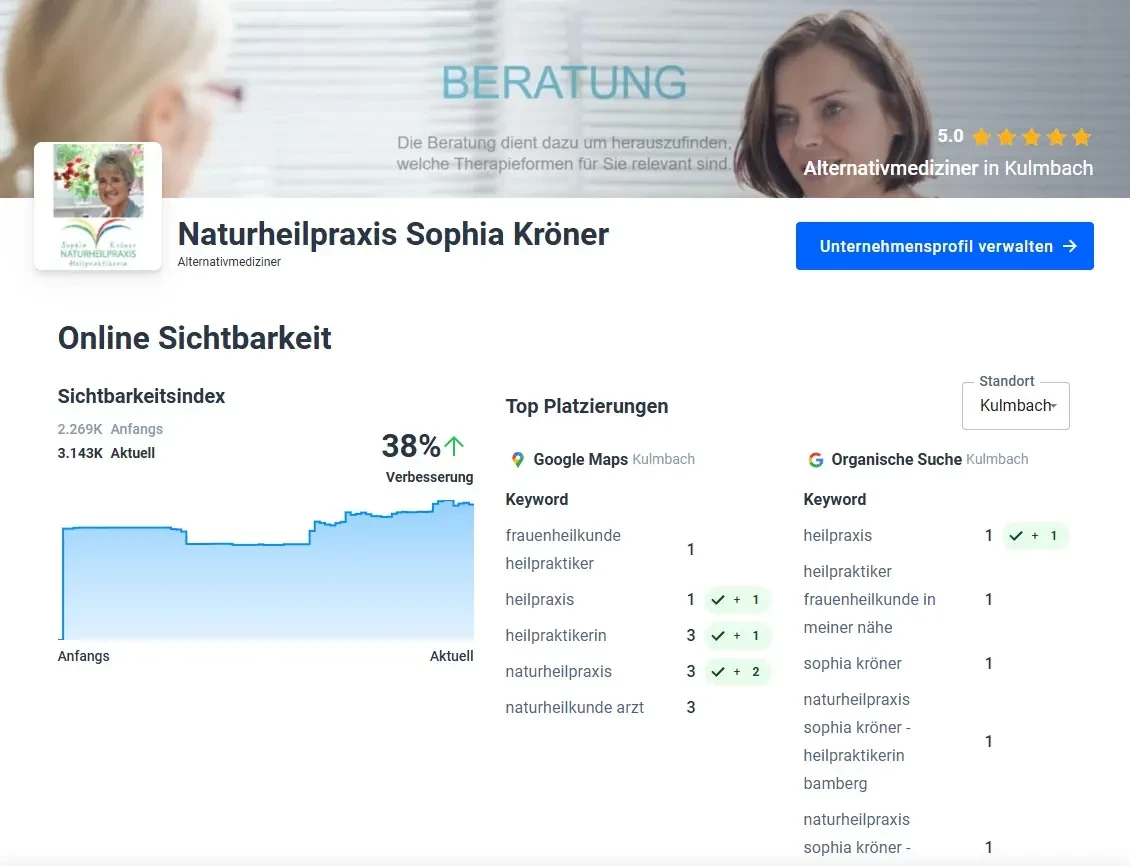 Dank dieser Maßnahmen konnte die Online-Präsenz der Praxis deutlich gestärkt werden. Mehr Sichtbarkeit, ein professioneller Auftritt und ein neues Akquise-Portal machen die Naturheilpraxis heute zur top-platzierten Adresse im digitalen Raum der Region.
