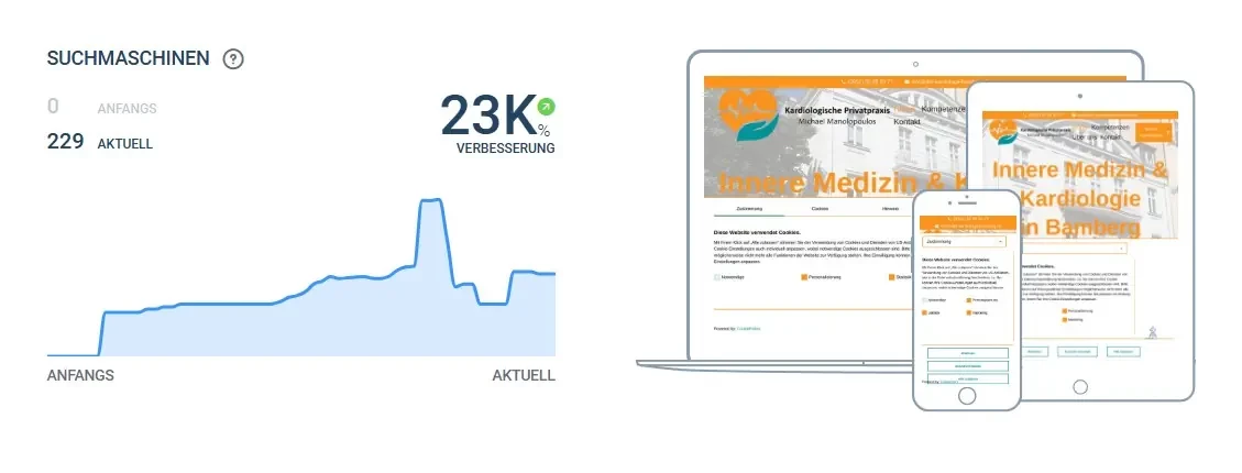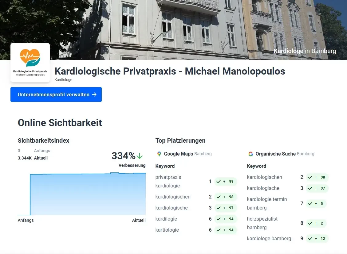 Für die Kardiologische Privatpraxis von Michael Manolopoulos in Bamberg wurde eine umfassende digitale Präsenz realisiert. Das Projekt umfasste die Entwicklung einer modernen, responsiven Website sowie die Einrichtung eines professionellen Local-Listings inklusive Google-Business-Profil.
