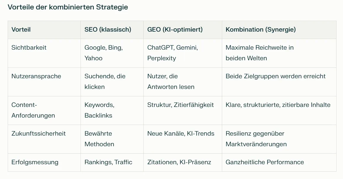 SEO und GEO folgen unterschiedlichen Bewertungskriterien. Durch die Kombination reduzieren Sie das Risiko, bei Änderungen eines Systems plötzlich an Sichtbarkeit zu verlieren